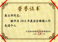 熱烈祝賀公司工會主席彭玉華獲得密雲開發區2016年度安全維穩工作先進個人