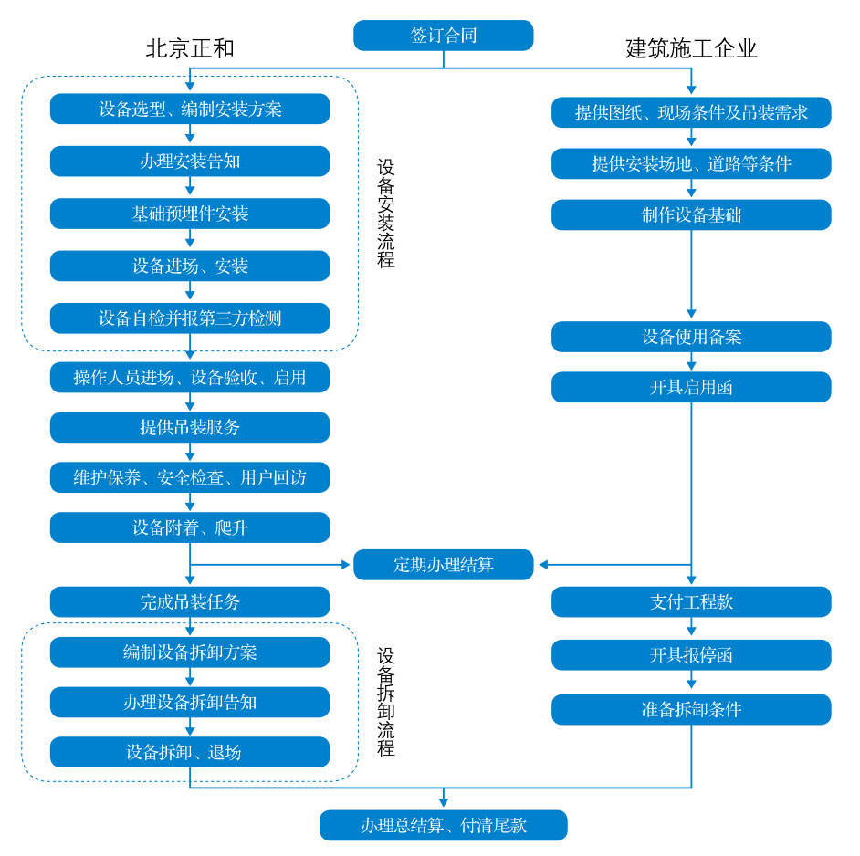 公司緻力于爲建築施工企業提供垂直運輸整體解決方案,在提供建築起重設備租賃服務的同時,提供所出租設備的安裝拆卸服務。爲完整反映公司設備出租及安裝拆卸的全過程,以下租賃服務流程圖包含了所出租設備的安裝拆卸流程。