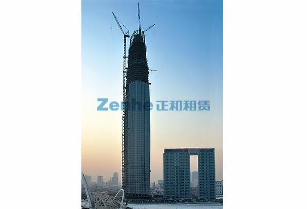 工程位于天津市核心地段,塔樓高度336.9米,爲中國長江以北地區的第一高樓。爲滿足結構施工的需要,公司承接了該工程的4台塔吊的租賃和安拆任務,分别是H3/36B、K30/21、ST70/30、MC320塔吊,此外公司還承接了兩台由法福克公司生産的動臂式變幅的内爬塔吊M600D、M440D及1台外附式ZSL1000塔吊的安拆、爬升任務。